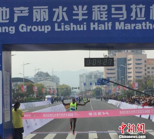 2016浙江麗水半程馬拉松開跑,來自坦桑尼亞的男選手率先沖過終點(diǎn) 李婷婷 攝