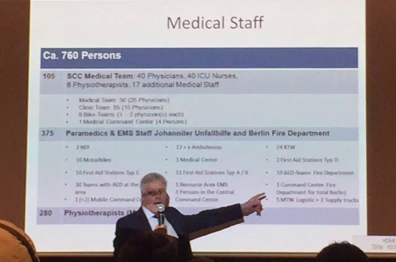 本次峰會特別邀請三位世界頂級馬拉松的首席醫(yī)療官——來自紐約的Stuart Weiss博士、來自東京的Hideharu Tanaka博士以及來自柏林的Lars Brechtel博士。會上,三位博士與參會的政府代表、保險公司以及體育賽事的安全保障方和合作方通過探討國際案例的方式,進行健康與安全領域的觀點與學識的交流分享,包括醫(yī)療支持系統(tǒng)(例如PAD)、醫(yī)療危機管理、馬拉松應急預案等等。
